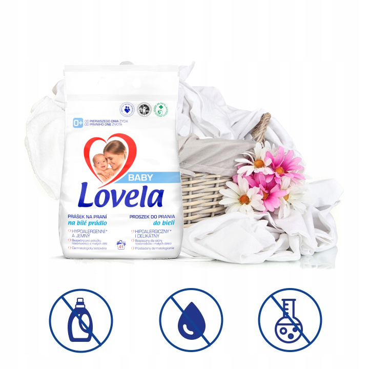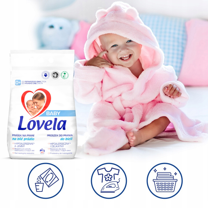 LOVELA Baby White to hipoalergiczny proszek do prania białego dla dzieci – o składzie opracowanym specjalnie z myślą o bardzo wrażliwej skórze ⭐ Doskonały do prania ubranek noworodka oraz do prania pieluszek i bielizny dziecięcej, a także ubrań całej rodziny.