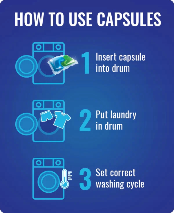 Szybkie i wygodne pranie. Kapsułki w całości rozpuszczają się podczas prania i dają pewność, że dozowanie na jeden cykl prania jest właściwe.