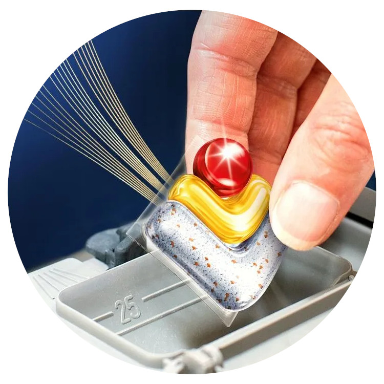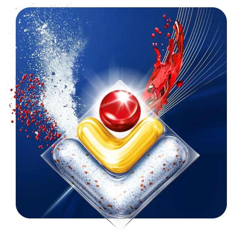 Zaawansowana formuła kapsułek skutecznie usuwa nawet przypalone pozostałości jedzenia – bez konieczności wstępnego płukania – zapewniając aż 4 różne działania w cyklu zmywania.