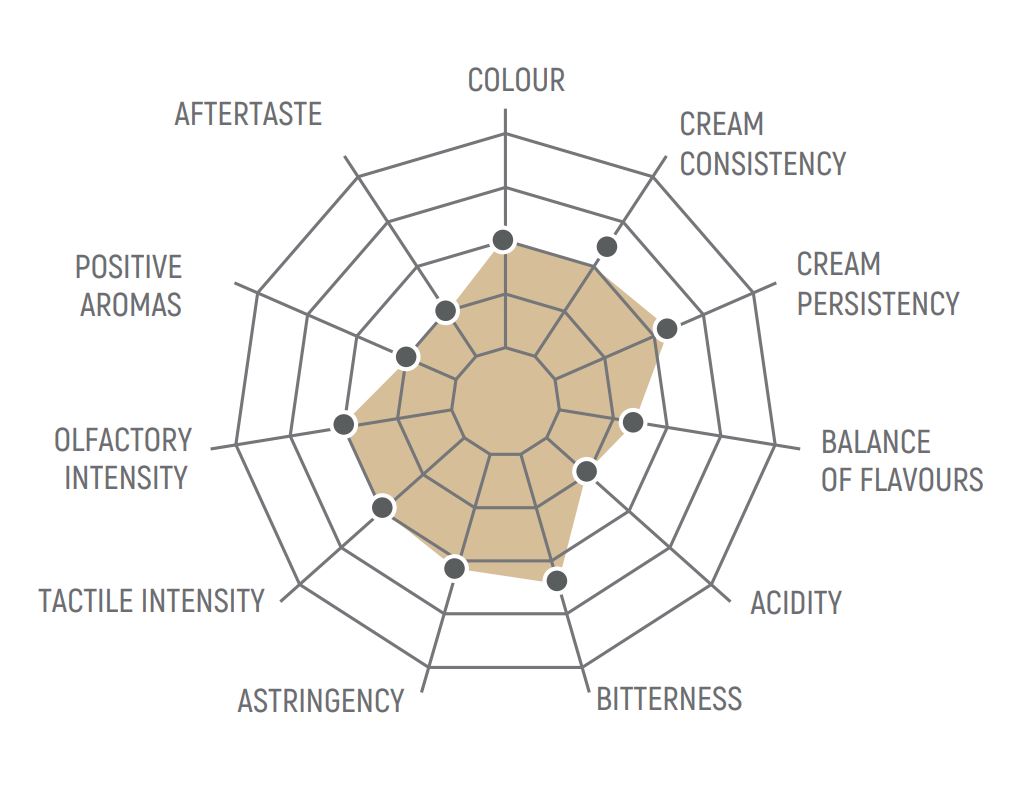 - Crema: Ciemnobrązowy kolor, kremowy o wyczuwalnej konsystencji, bardzo gęsty i trwały.
