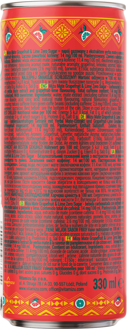 Woda, Ekstrakt Mate (Zawiera Kofeinę: 11.4 Mg/100 Ml), Dwutlenek Węgla, Kwas: Kwas Cytrynowy; Naturalny Aromat Mate, Naturalne Aromaty: Grapefruit, Limonka; Aromat: Naturalna Kofeina Z Zielonych Ziaren Kawy (2.6 Mg/100 Ml), Barwnik: E150a; Substancja Słodząca: Sukraloza.
