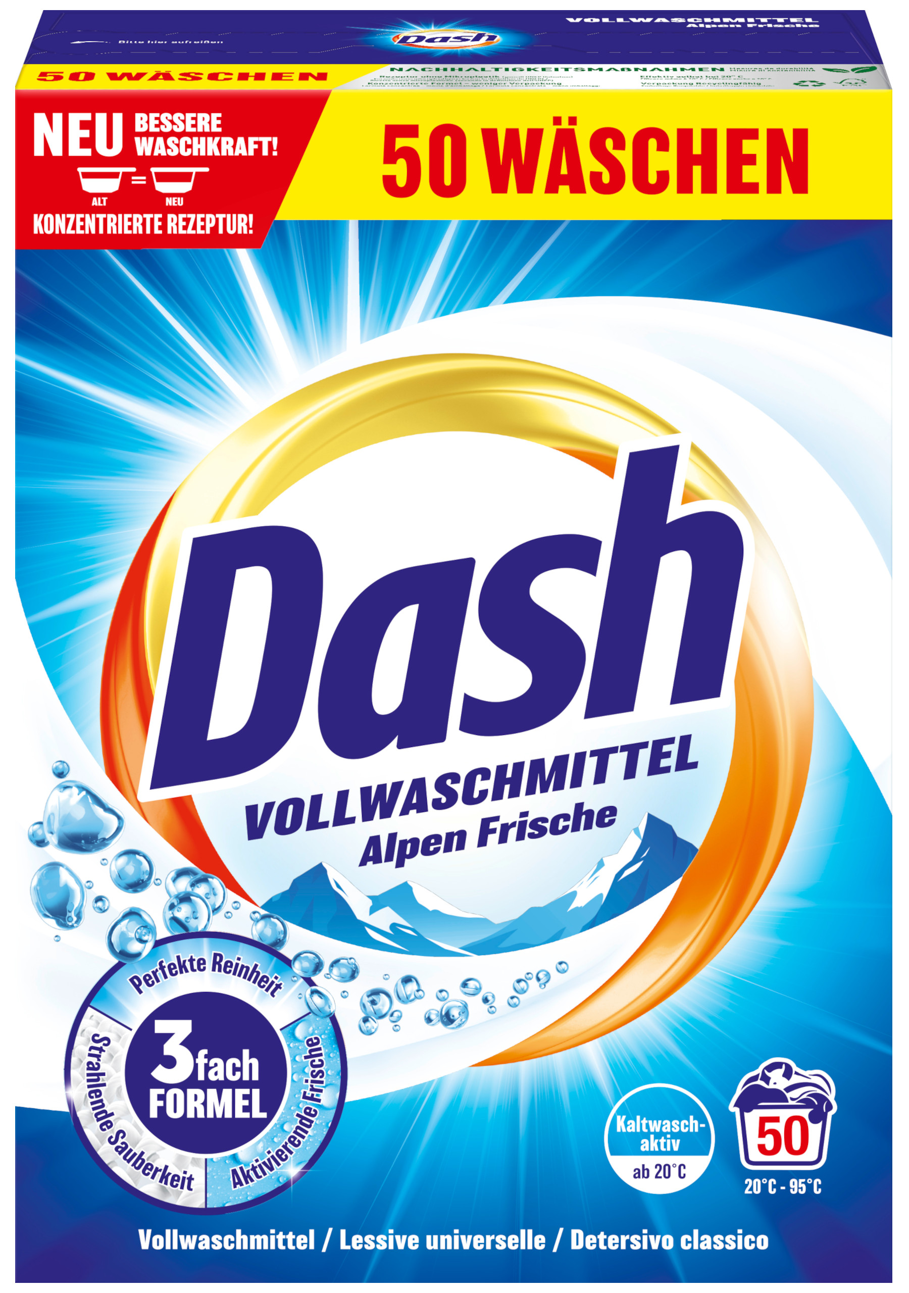 Dash Alpen Frische to wysokiej jakości uniwersalny proszek do prania, który zapewnia perfekcyjną czystość, promienną biel i długotrwałą świeżość już od 20°C ⭐ Dzięki nowej, skoncentrowanej formule skutecznie usuwa zabrudzenia, jednocześnie chroniąc tkaniny przed szarzeniem i utratą świeżości.